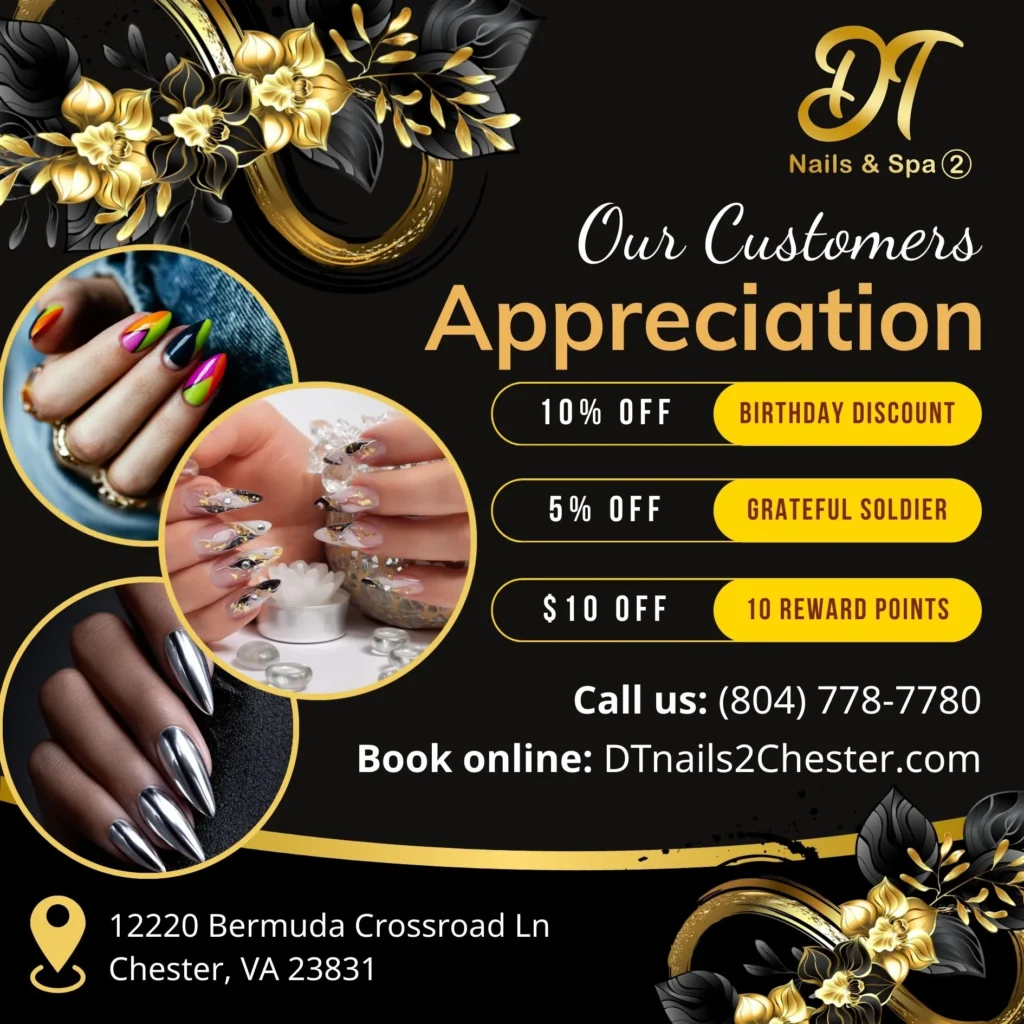 ***Designs may vary depending on skill level, time, and any extra length or shape. We also offer free consultations on all DT NAILS & SPA services to ensure the best fit for you**